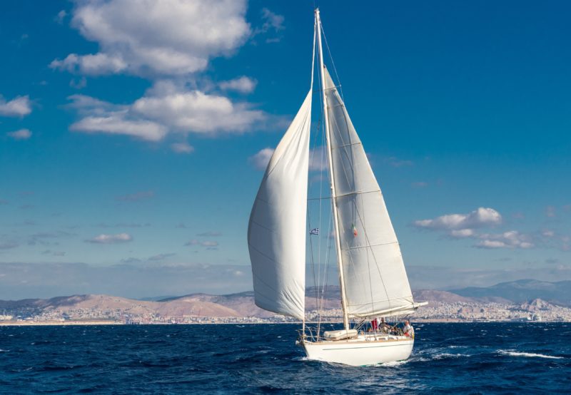 White yacht sailing on a clear sunny day.Waves and water splashes. Greece
