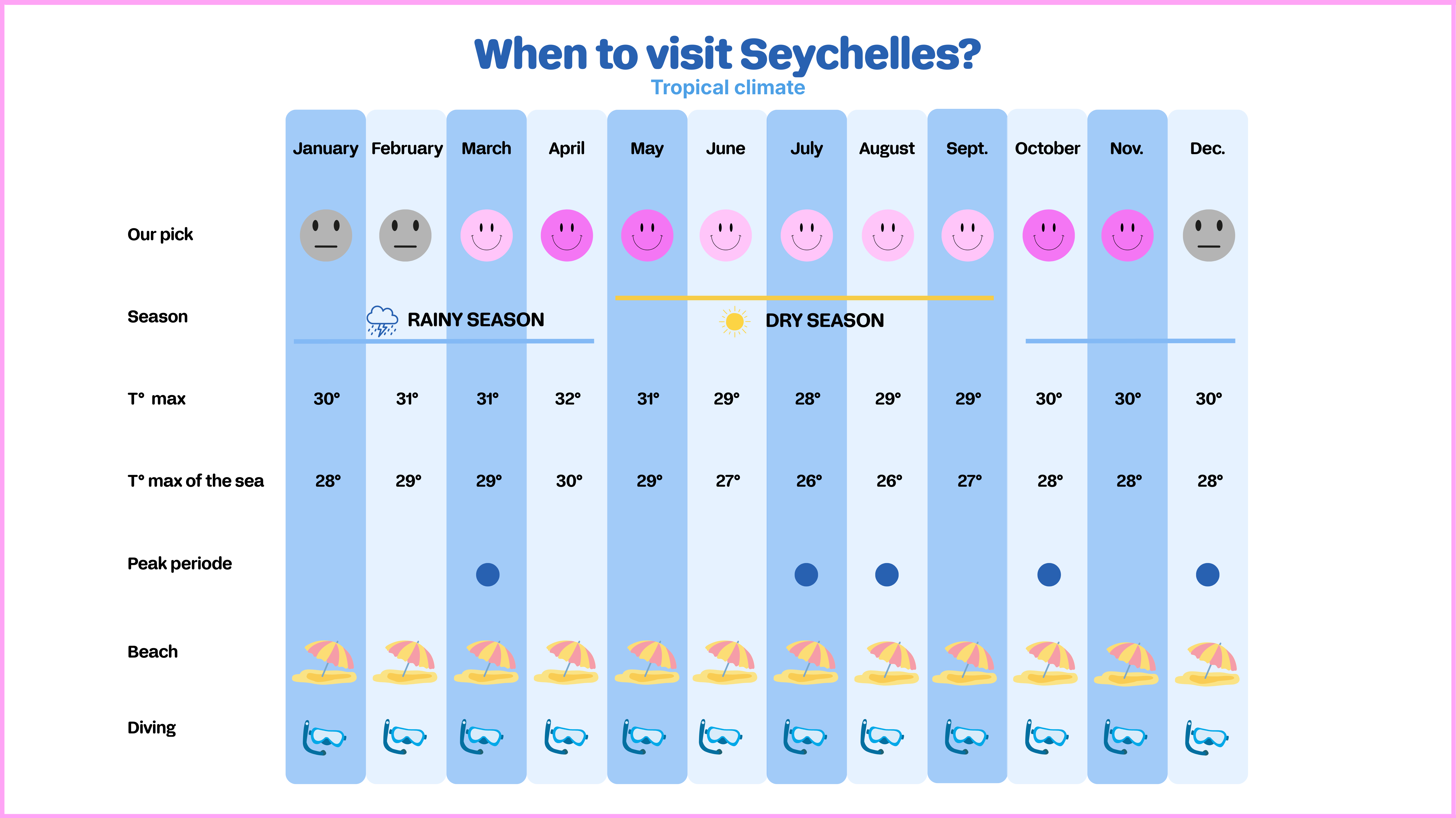 The Seychelles has a warm tropical climate all year around, between 26°C and 31°C, with a high UV index. There is not really a bad reason : simply different conditions depending on the months.
