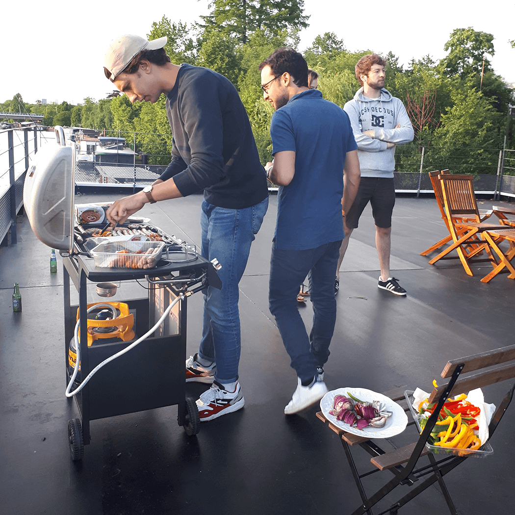 Última adquisición de la start-up: ¡un barbacoa! Sí sí, el verano está llegando, los días se alargan, las tardes se hacen suaves y agradables entonces, sería una pena perder la oportunidad de aprovechar nuestra terraza. Los barbacoas son infalibles. ¡Después una larga jornada de trabajo, se puede disfrutar y relajarse comiendo y bebiendo unas cervezas! Se charla, se divierte, se pesca pero sobre todo, se tejen lazos que desarrollan la cohesión del equipo. Hay un dicho, viejo como el mundo: «Asar une».